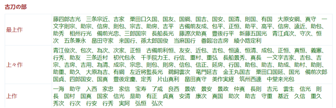 中上作家吉 家能 家次 家貞 春光 治国 友重 具衝 近則 周重 包貞 包真 包元 兼音 兼友 兼吉 兼谷 兼常 兼綱 兼氏 兼国 三代兼定 関兼定 兼定 兼光 兼久 三代兼元 後代兼元 助次 助長 初代助宗 祐光 資永 資正 景光 重治 重吉 重武 重国 重並 重泰 重艦 重貞 重光 広家 広賀 広次 広助 平国 久光 元近 通吉 光重 行安 行光 加州清光 与三左衛門尉清光 大石左 清綱 二代義助 吉包 吉房 実忠 実次 真屋 定能 昌利 顕国 与五郎康重 藤右衛門尉康重 正家 正吉 正利 正信 正宗 安吉 末月山 軍勝 国助 国次 国昌 井原国重 左兵衛国重 国広 国久 国守 平安城信国 氏貞 氏房 能秀 祥末 武永 綱家 綱善 村重 三代村正 長吉 次広