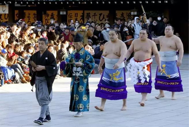 (小太刀炮切长光) 3.太刀持(佩戴太刀) 在日本佩戴太刀是男权的荣耀,举例来说相扑作为日本的国技,仪式感是神圣而庄严的。横纲(最高段位)在入场时是要握持太刀,展现力士与刀剑带来的威仪。关于太刀持的说法也有认为刀剑神力能净化比赛环境的,力士的特殊身份也可以将刀剑的威仪发挥淋漓尽致。带上场的太刀通常会采用阵太刀拵的样式。里面的刀条原来会选用真正的刀身,二战以后多为竹、木类削成的装饰性刀身。 4.名为天下五剑的太刀 天下五剑指的是镰仓初期以前制作的五只太刀的合成,这个称号在室町时期就流行开来了,每一支都被认为是名品中的名品。到了德川时期八代将军德川吉宗编纂的《享保名物帐》里汇聚了彼时遗留下的几百只名物级刀剑,仍将五剑放在榜首。五剑的特点无一例外全是生茎在铭的太刀。他们分别是: ◇国宝「太刀 銘 安綱」[名物:童子切安綱] ◇御物「太刀 銘 国綱」[名物:鬼丸国纲] ◇重文「太刀 銘 恒次」[名物:数珠丸恒次] ◇国宝「太刀 銘 光世作」[名物:大典太光世] ◇国宝「太刀 銘 三条」[名物:三日月宗近] 值得一提的是,五剑历尽风霜雨雪 战火纷飞,至今仍然全部完好在世,被世人所珍重保存。