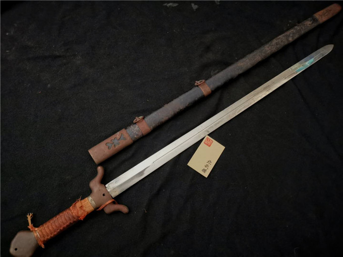 上图为军博同款蓝翎侍卫剑 数据: 全长~含鞘全长105.5厘米 清道光时期蓝翎侍卫剑这款剑在北京军博有相同款式,因传清道光时期皇室戊戌科蓝翎侍卫,武六品郝上痒,曾以此款剑在宫中杀贼,被道光皇帝嘉奖,所以此款剑被冠以蓝翎侍卫剑之名,在中国刀剑一书中217业有详细介绍,总而言之是一把标准器。这款剑制作非常特殊,剑阁带有闭锁设计(卡鎨年久缺失),剑首固定方式也非常特殊,剑身精磨血槽开制规矩,剑鞘为铁鞘上大漆,大漆有脱落现象,铁鞘略有不直,整个装具为素铜装,铜件呈巧克力色非常漂亮。