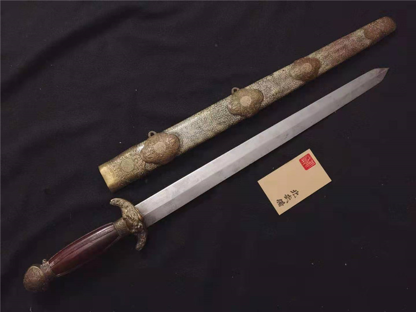 数据: 含鞘全长64.5厘米,刃长42.6厘米,刃宽3.2厘米,刃厚0.4厘米, 福寿龙泉剑常见于南方两广福建等地区,因其装具带有蝙蝠和寿字纹饰和福寿剑比较像,但是剑阁却是睚眦剑阁和龙泉剑的剑阁相同,这种剑结合了福寿剑和龙泉剑的特点,所以刀剑爱好者称作这种装具的剑为福寿龙泉剑,这支福寿龙泉剑整体状态一流,配件齐全纹理清晰,红木握把保存完整,剑身精研剑脊笔直,刃部保存也非常不错,剑鞘包裹大颗粒的鱼皮,这种原装原配没有动手整理过的福寿龙泉剑在同类剑里也是不常见的精品了!!! | ||||||||||