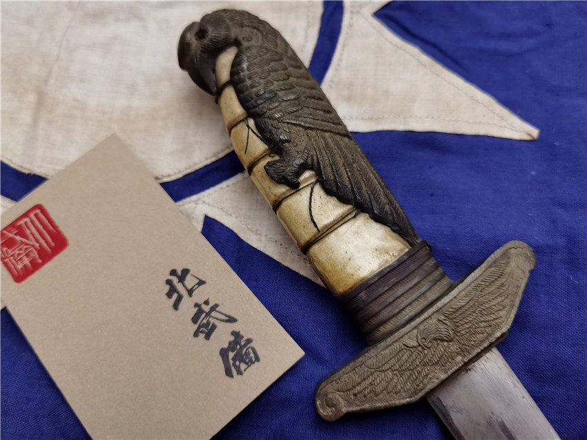 数据: 全长38厘米,刃长22.8厘米,刃宽2.2厘米,刃厚3.5厘米。 二战时期國民黨空军佩剑,这种鹦鹉剑有长短两个版本,短款多见于国外,是二战时期國民黨赠送给国外援华飞虎队飞行员的随身佩剑,长款很少见多为本土遗留,应该是当时國民黨装备给本土空军飞行员的,这支鹦鹉剑整体状态非常好,保留了最原始的状态,黄铜握把制作成鹦鹉形状,取其英武之意,剑阁处为展翅飞翔的鹦鹉图案(代表空军),黄铜柄丝有断,握把包赛璐璐略有破损,一支鹦鹉眼缺失,剑刃保存完好没有开刃,原配剑鞘状态也非常不错,鞘口处有鹦鹉和飞机螺旋桨的图案,这种鹦鹉佩剑在没有整理过的情况能保存这种状态实属不易,在二战后期因为政治原因被大批量销毁,加之空军在二战时期人员稀少,本身装备量也不是很大,所以这种鹦鹉剑收藏价值极高!!! | ||||||||||