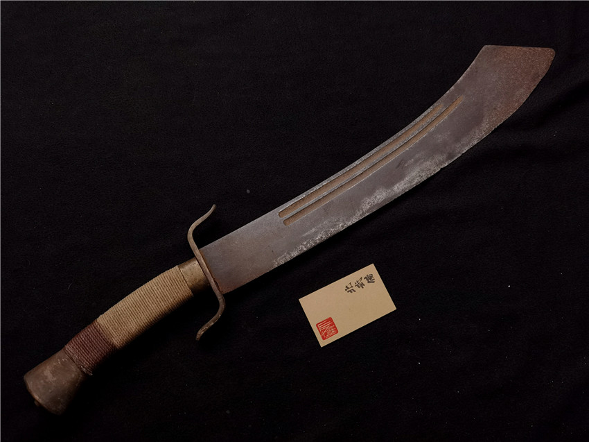 数据: 全长70.5厘米,刃长51厘米,刀根部宽度 5.5厘米,刀头宽度8.2厘米,刀根厚度0.9厘米,刀头厚度0.42厘米。 这支砍整体状态良好,原铆,原配柄三件,原配老柄木,刃部厚实原始状态没有后期整理研磨,刀身血槽开制异常规整,握柄和常见砍不同,常见砍多为直柄,这支砍柄带有弧度,这种设计更适合劈砍,铜挡手厚实S型设计 ,这支砍的造型和新军一款砍非常相似, 因为资料缺失只能按照新军砍分类,确实是不常见的藏品,极有可能是当时用来行刑用的一种砍!!! | ||||||||||