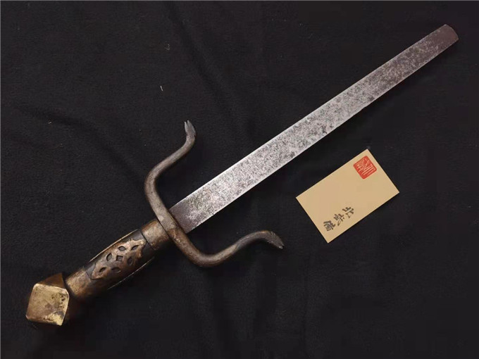 数据: 全长51厘米,刃长36.6厘米,刃宽2.9厘米,刃厚1.21厘米。 这支铁尺是中国道教非常有特点的兵器,整体制作精美,柄首铜八宝,尾铆有漂亮的铜铆花,木柄四周都包铜,柄这种制作的方式非常少,铜档U型造型,并雕刻兽头,铁尺精钢打造并且可有道教的符文及文字(文字待考)研究价值极高,尺身非常的厚重,胞浆舒服自然,在彭鹏先生的著作刀兵相见一书里197页,有关于这种铁尺的介绍,这支铁尺因为档手有兽头工艺,做工相对来说更好一些。 | ||||||||||