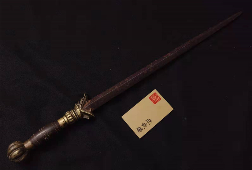 全长57.5厘米,鐗身菱形,活眼龙吞特别大,瓜棱柄首原铆,牛角柄握把保存状态完好。