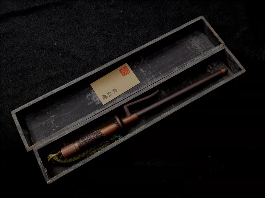 数据: 全长39厘米,十手前部长24.3厘米,柄长13.5厘米, 直径1.3厘米,小枝长8.3厘米。 十手,日本官方称呼为"十手"日文作"サイ",该型武器英文名由日文音译为"Sai",中文作"十手"。与中国铁尺有相似之处,又有区别。现在常用于空手道的器械教学,又称空手道短叉。至于忍者匕首称法是自忍者神龟这一动画产生后叫出的俗称。曾经有文献记载,十手是由日本江户时代时来自中国的陈元赟所传至日本的柔术武具之一(《近世事物考》);可是在室町时代中期十手术已经在日本广泛流传,而且在战国时代十手更是以威力能劈开头盔而著名的武器。所以陈元赟是十手创制人的说法,亦只是一种传言而已。 十手的设计就是用来克制刀剑用的。自近代起,十手将中刺(saki)两旁的横架(monouji)改成了向上的样子;持柄末端加上锤头(saikasika),用于加强直拳反击的破坏力。十手成为了现在我们看到的形态。该设计是针对太刀的,用于卡刀--断刀--攻喉,而且很明显,其防御力强于攻击力。在没有什么资源的硫球人手中,威力无穷的铁尺被改进成了"十手"这么一类由低碳钢,甚至仅仅只是生铁构成的低成本武器。 这支十手非常漂亮,经过几百年的使用盘玩表面已经有了非常漂亮的包浆,整体工艺铜铁结合,握把用到了红铜,黄铜和紫铜三种铜,十手挡手圆形设计,镡厚实两侧带有铜花片,就连小枝部位也做了精细的处理,可见匠人在制作这支十手的时候下了足够的细工,绝对是十手中的精品,是入藏的精品!!! | ||||||||||